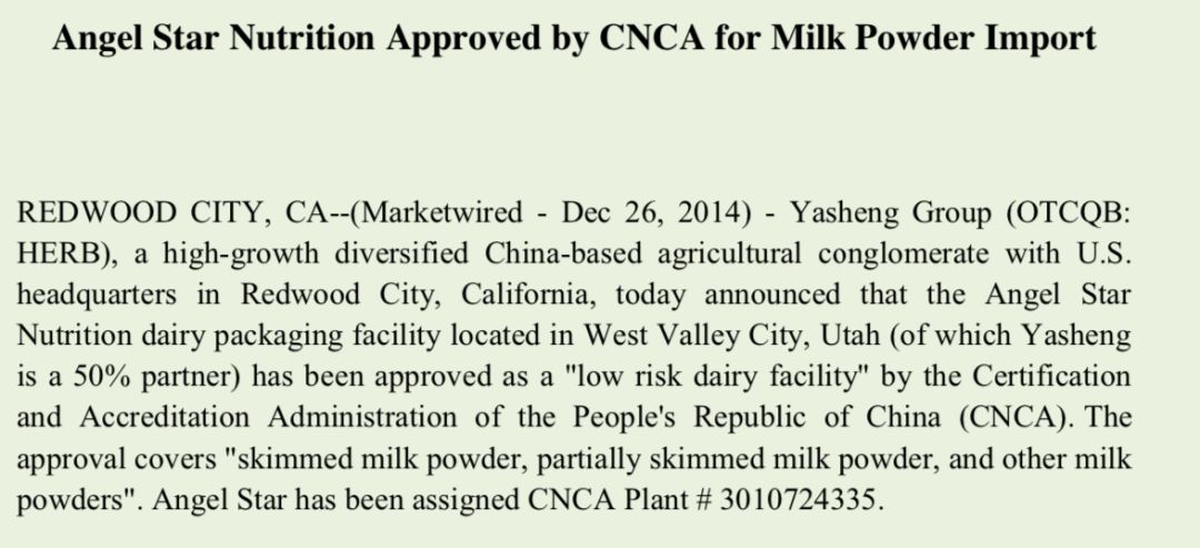 Angel Star Nutrition,位于美國猶他州的W Valley City(西瓦利城)。早在2014年,該廠就曾獲得中國認監委的注冊批準,不過當時的注冊產品并不包括嬰幼兒配方乳粉。