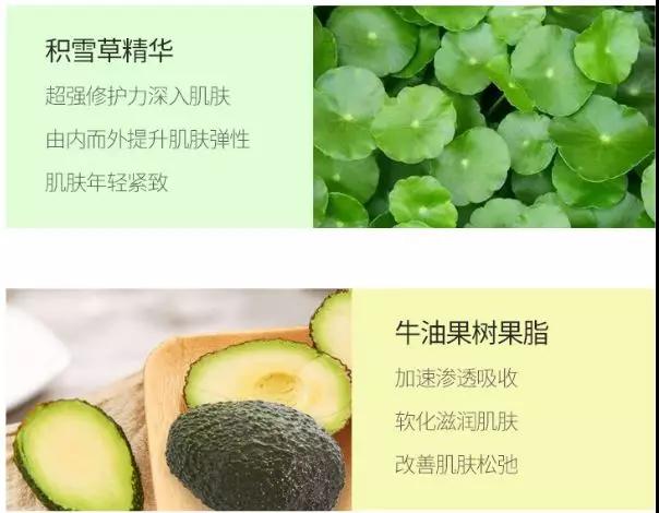 除華熙生物旗下護膚品的靈魂成分玻尿酸外,甄選積雪草精華對肌膚進行修護。內含豐富的牛油果樹果脂,可以軟化滋潤肌膚,改善肌膚松弛,讓肌膚潤澤飽滿;
