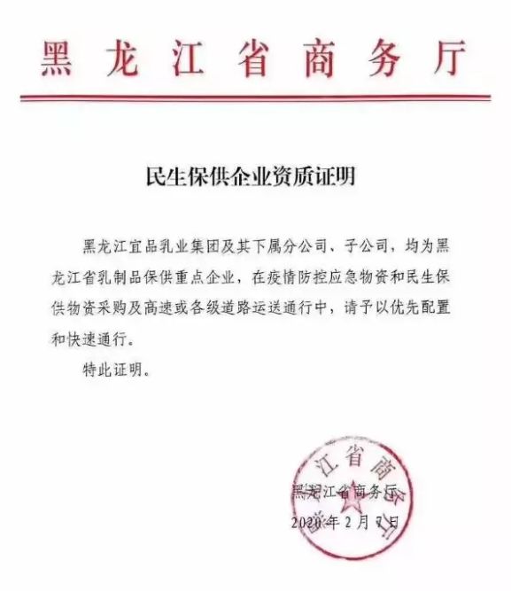 02 “賦”諸暖心行動,宜品慧賦線上線下送貨到家 全國上下居家隔離人群龐大,諸多媽媽反映家里奶粉告急,為保證寶寶口糧不斷供,黑龍江政府部門為宜品乳業集團開設優先“綠色通道”證明。