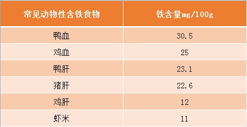 干紅棗中的鐵含量比較低,每 100g 中只含有 2.3mg 的鐵。一些動物性食品中的鐵含量較高,具體的可以看下面的表格。