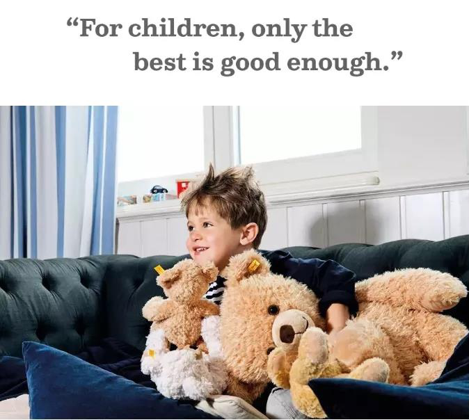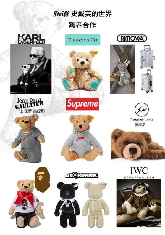 得到父母的認可是成為孩子心愛玩具的第一步,當史戴芙Steiff得到了爸爸媽媽們的喜愛,進入大眾視野的兒童系列和嬰兒系列就有了廣闊的市場基礎。史戴芙Steiff在兒童系列里都采用了柔軟、耐用、防過敏的高品質安全面料(專門針對3到14歲的兒童群體研發);而嬰兒系列則是從寶寶出生的那一刻就可以使用,大多采用了純棉或有機棉的材質,就連眼睛也都換成了刺繡工藝,以確保寶寶的安全。這部分產品跟收藏者系列有很大不同,產品更強調柔軟、親膚、舒適性,造型也更加童趣可愛,每年有近400個品種可供售賣,價位也更加親民。 除此之外,史戴芙Steiff有很多被大家所熟識的跨界合作,很多和史戴芙Steiff擁有相同消費群體定位的品牌都愿意攜手合作,打造帶有雙方特色的史戴芙Steiff泰迪熊,不管是和奢侈老牌路易威登、Tiffany、IWC萬國的合作,還是與時尚潮牌藤原浩、BAPE、Supreme的聯名,都讓史戴芙Steiff在更多不同年齡段的消費群體心中留下了深刻印象。