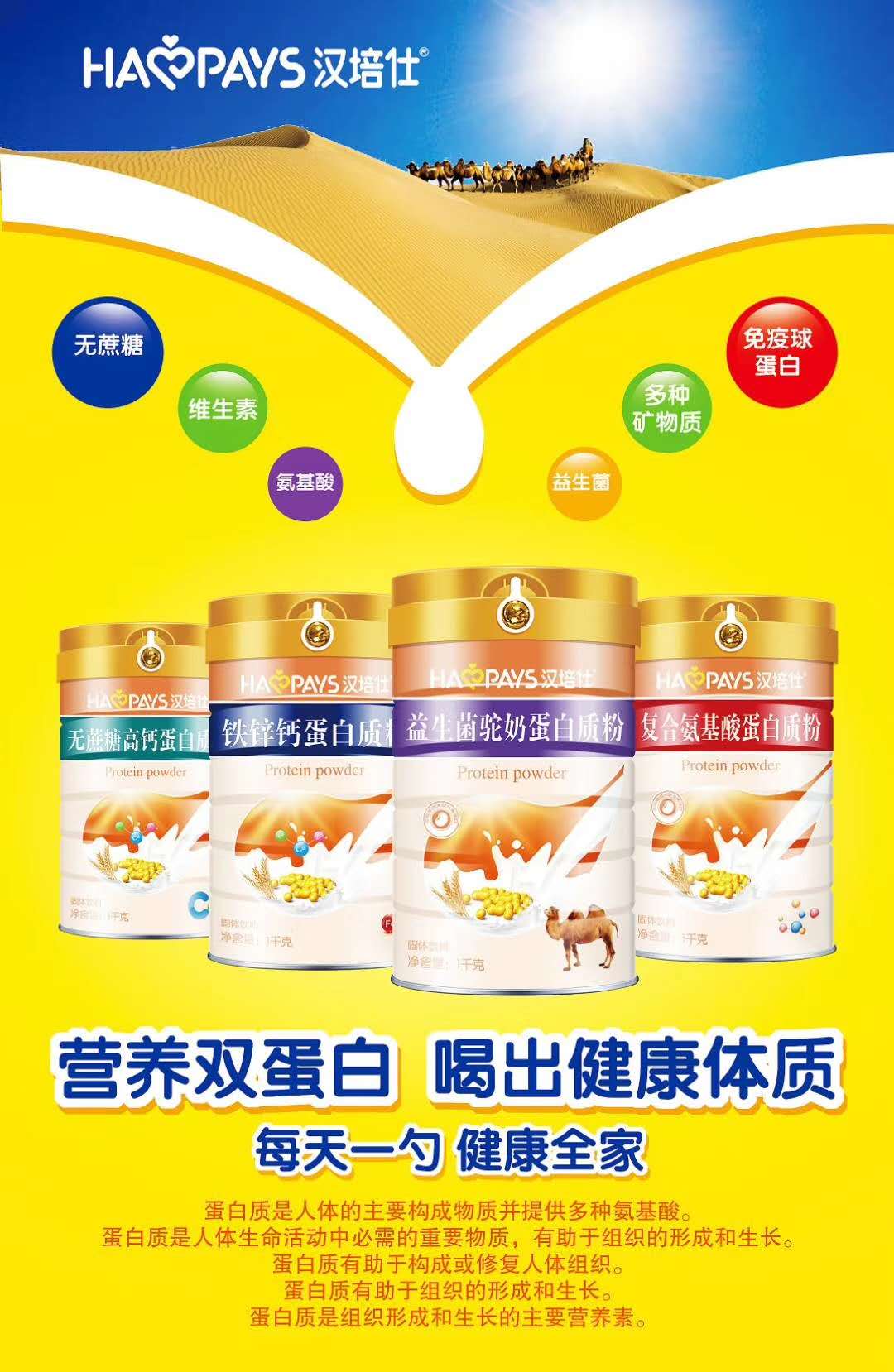 此次,上新的漢培仕蛋白質粉,一共推出了益生菌駝奶、鐵鋅鈣、復合氨基酸、無蔗糖高鈣四大配方單品,依托背后企業強大的技術實力,先進的生產設備以及GMP生產車間,嚴格的質量把控,使得其擁有高品質,備受廣大消費者認可。 漢培仕益生菌駝奶蛋白質粉 精選天然優質駝奶為主要原料,科學配比成長所需的多種營養元素,更添加了益生菌,對腸道健康十分有益,工藝精湛,口感純正,可全家共享,守護健康! 漢培仕鐵鋅鈣蛋白質粉 精選非轉基因大豆分離蛋白,動植物雙蛋白組合,科學配比鈣鐵鋅,營養補充更加全面,口感純正,更易吸收,全家人都愛喝 漢培仕無蔗糖高鈣蛋白質粉 以非轉基因大豆為主要原料,經過多重先進的生產工藝制作,科學配比多種營養成分,含鈣量高,好口感,高營養,易吸收,不添加蔗糖,非常適合中老年人飲用。 目前,漢培仕蛋白質粉系列均已全面上市,正攜手火爆網在全國誠招優秀的代理經銷商,款款精品,守護全家人健康,這樣的趨勢爆品,怎能錯過? 【溫馨提示】:以上成分內容為科普知識,僅供消費者參考學習,不代表產品功效,請消費者理性閱讀,以上產品不能代替藥品。 漢培仕復合氨基酸蛋白質粉 以天然高蛋白植物為原料,采用先進的生化工程技術,從植物中提取,分離多種氨基酸精致而成,可提供更全面的營養,每天一杯,健康加倍。 |