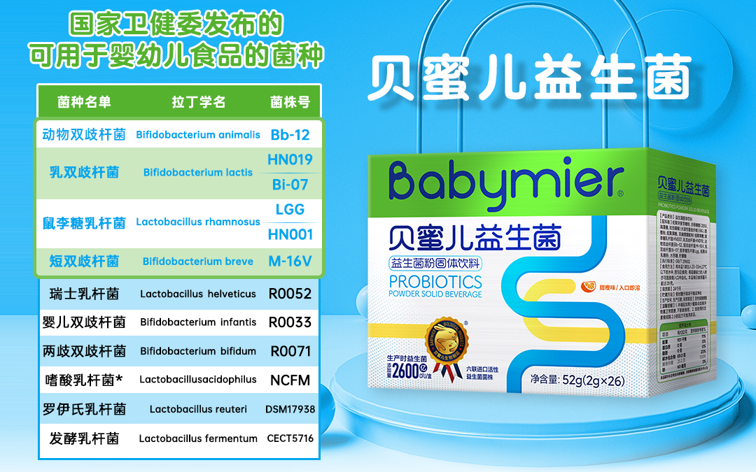 此次新品貝蜜兒益生菌,采用國家衛計委公告可用于嬰幼兒食品的菌株,每袋含有6聯進口益生菌,使用的菌株HN001、HN019、Bi-07、Lgg、Bb-12、M-16V,來源于美國杜邦、丹麥科漢森及日本明治,均是有大量國內和國際臨床研究驗證的,耐胃酸耐膽汁、安全的菌株。