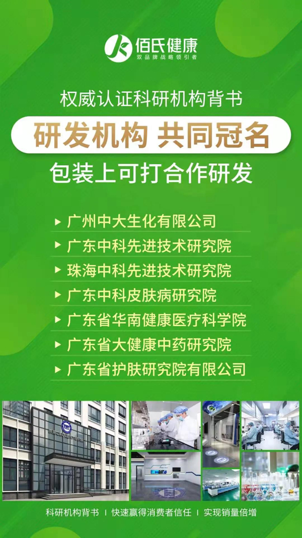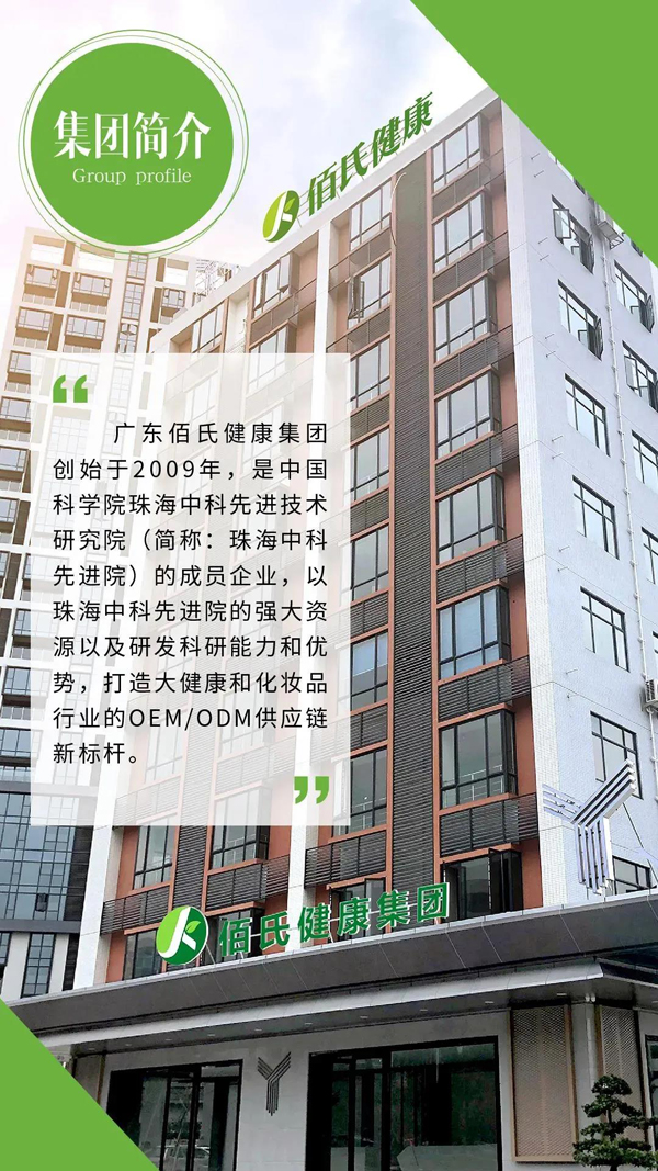 佰氏健康集團簡介 廣東佰氏健康集團創始于2009年,是中國科學院珠海中科先進技術研究院(簡稱:珠海中科先進院)的成員企業,以珠海中科先進院的強大資源以及研發科研能力和優勢,打造大健康和化妝品行業的0EM/ODM供應鏈新標桿。