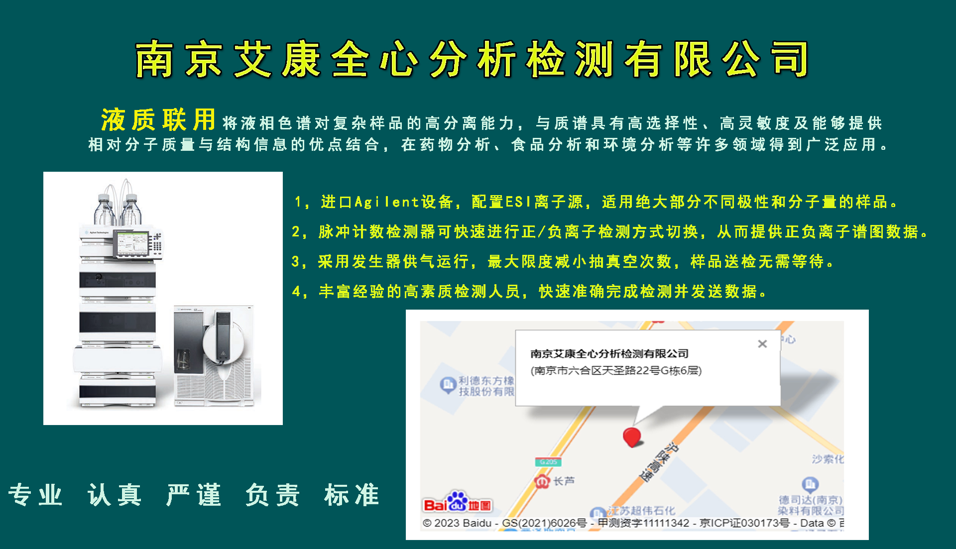 艾康全心分析檢測中心,技術領先,設備齊全。我們擁有國內先進的400M核磁共振波譜儀,以及全套Agilent系列的高效液相儀、氣相色譜儀等大型分析儀器。我們的專業團隊將為您提供一站式的檢測服務,為您的健康護航。選擇南京艾康全心,選擇專業與信賴。