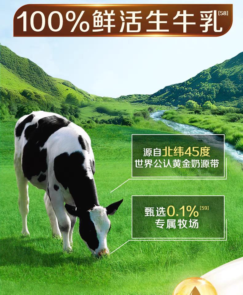 配方迭代升級,讓智慧營養更好吸收 金領冠育護產品升級,配方迭代是重點,強化了DHA的含量與吸收力優勢,助力寶寶大腦發育。依托20多年母乳研究與中國專利配方[2]的加持,金領冠育護采用黃金配比“乳源[3]OPO”,能夠促進寶寶對關鍵營養的吸收;在補充寶寶腦部營養方面,金領冠育護“腦黃金”DHA含量也迎來“5倍提升”,助力寶寶認知更出色;此外,配方中還添加“α+β創新蛋白組合”、“專利核苷酸組合[2]”、“四倍活性益生菌[4]”,為寶寶腸道筑起防護墻,讓寶寶肚肚更舒服。 為了給寶寶更優質的營養,金領冠育護也從奶源入手下功夫。其臻選北緯45°全球公認黃金奶源帶的伊利自有0.1%專屬牧場[5],黃金乳蛋白含量高于國家和歐盟的標準,且運輸全程鎖鮮,原奶2小時直達工廠、100%生牛乳一次成粉,更大限度保留多種營養素活性,給寶寶帶來鮮活好營養。