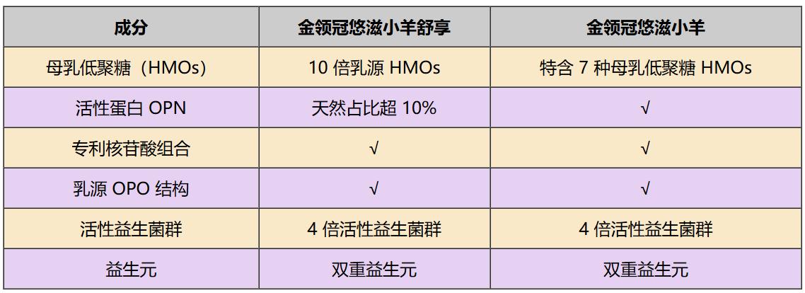 配方:科學配比,打造全方位成長守護 在配方創新方面,兩款產品各具特色。金領冠悠滋小羊舒享以母乳研究為藍本,含有10倍[8]乳源HMOs[9](母乳低聚糖),能有效激發寶寶免疫球蛋白sIgA倍增,構建腸道防御屏障,減少病菌感染風險。值得一提的是,金領冠悠滋小羊舒享中的乳鐵蛋白純度高達95%[10],能有效激活防護細胞,減少呼吸系統不適和肚肚不適,成為寶寶的保護力“外掛”。金領冠悠滋小羊則特含7種母乳低聚糖HMOs,幫助腸道降低有害菌黏附,守護腸道健康。 此外,活性蛋白OPN[11]與專利核苷酸組合[12]的加入,進一步強化了產品配方的協同效應。OPN作為初乳核心免疫蛋白,天然占比超10%[13],與乳鐵蛋白形成“雙活性CP”,協同提升寶寶自護力,讓營養吸收更高效。 對于新生兒來說,腸胃功能尚未發育完全,消化系統較為脆弱,因此許多寶寶在成長初期容易出現消化不適的癥狀,如脹氣、便秘或腹瀉等。針對這一常見問題,金領冠悠滋小羊舒享和金領冠悠滋小羊都進行了精心的配方設計:科學配比乳源OPO結構脂、4倍[14]活性益生菌群以及雙重[15]益生元黃金組合,這些成分相互協同,能夠有效調節腸道菌群,促進營養吸收,減少寶寶腸胃不適,讓寶寶的小肚肚更舒適,助力健康成長。